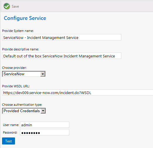 Property Description Provide System name Edit the name that identifies this ITSM system. Provide descriptive name Edit the brief description of this ITSM system. This description is listed in the System Descriptioncolumn of theITSM Integrationview.Choose provider Select the provider of this ITSM service: ServiceNow,Remedy, orOthers.Provide WSDL URL Edit the URL to your instance of the ITSM system.