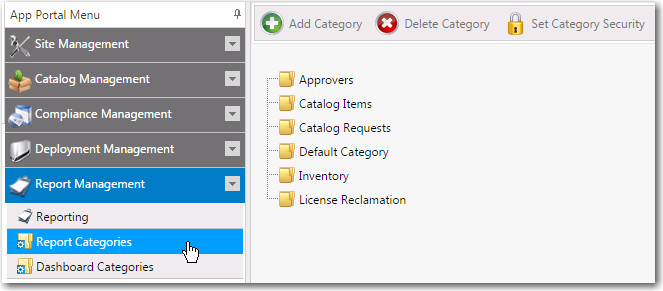 Under Report Management, select Report Categories. Existing categories are listed in the right pane.
