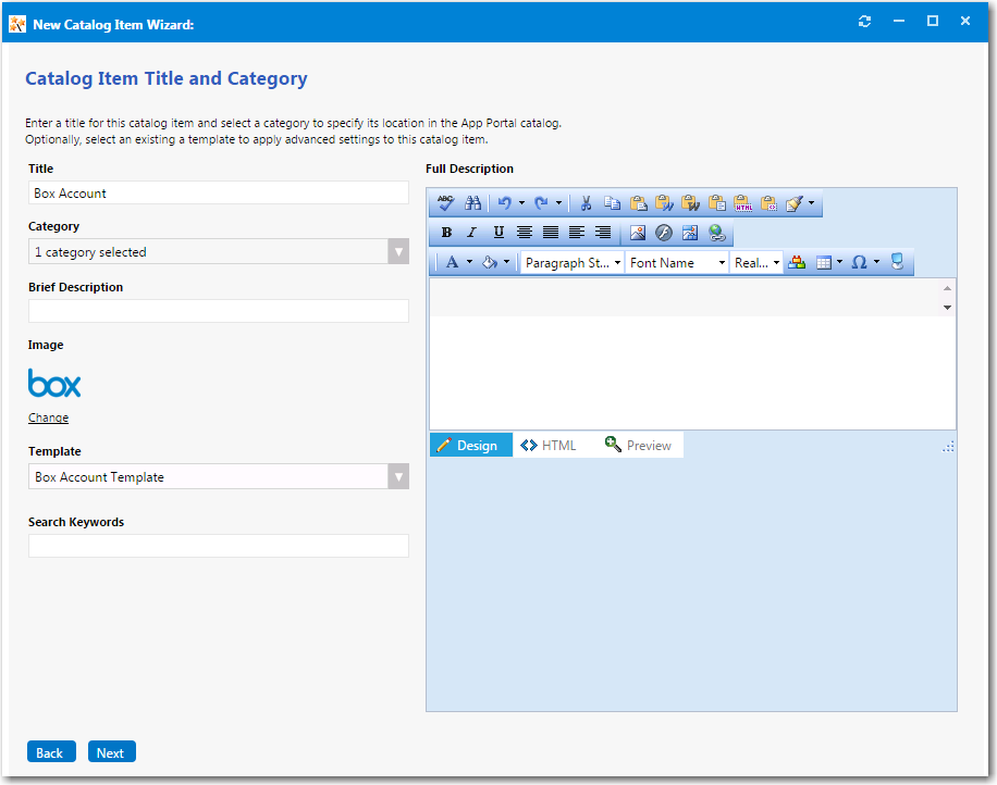 In the Title field, enter a title to identify this catalog item in your App Portal storefront, such as Box Account or Office 365 Account.