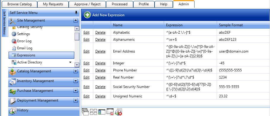 1. On the Admin tab, open the Expressions subview of the Site Management view. The Expressions view opens.