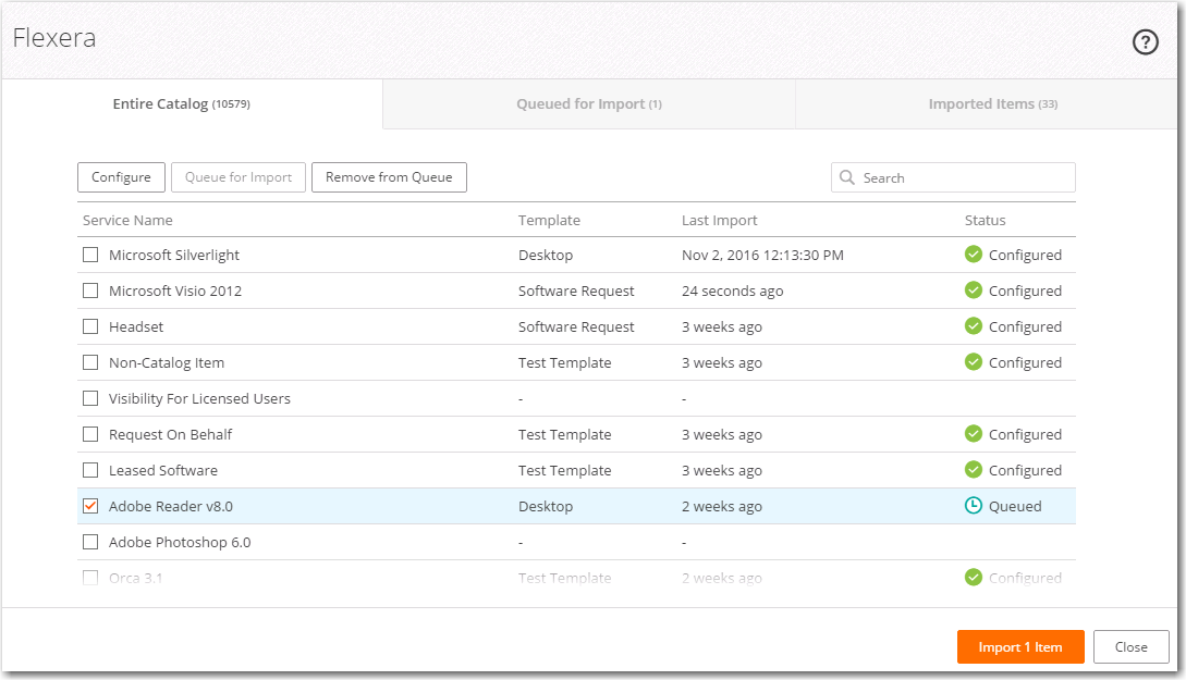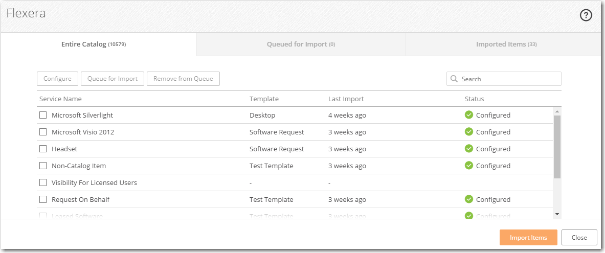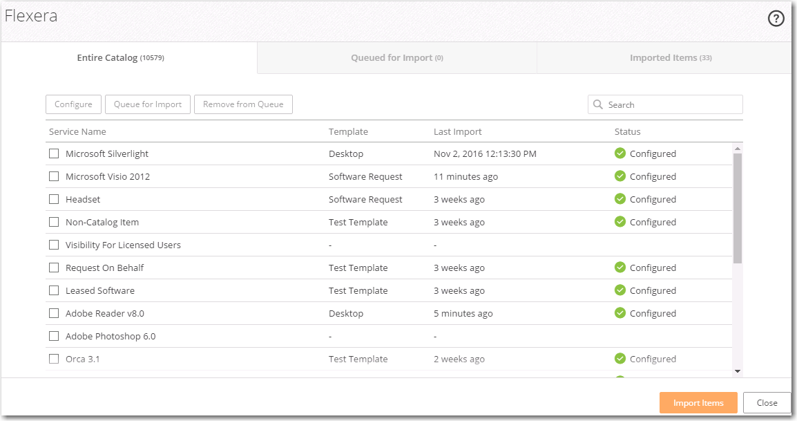 13. Double click on Flexera. The Entire Catalog tab of the Flexera page opens, and the Last Import column of the catalog item lists the time period since the import (such as 5 minutes) and the Status column is changed to Configured.