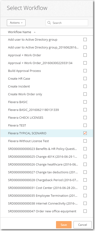 6. Select a workflow, such as Flexera TYPICAL SCENARIO, and click Save.