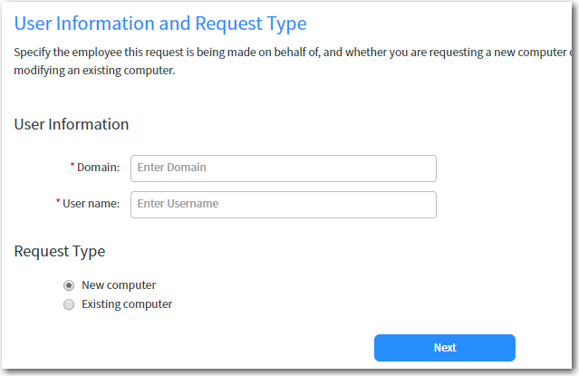 Click on Employee App Provision Request in the ServiceNow menu. The User Information and Request Type panel of the wizard opens.