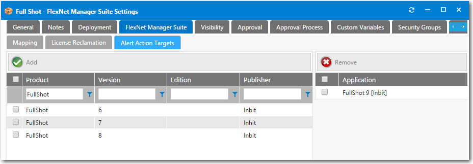 Open the General catalog item in the Catalog Item Properties dialog box and open the FlexNet Manager Suite > Alert Action Targets tab.