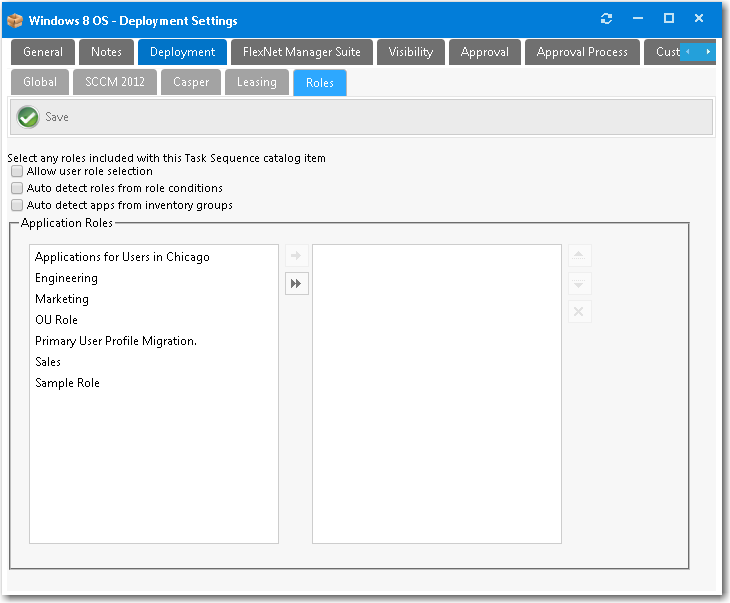 noteIf you are editing a Software or General catalog item (instead of a Task Sequence catalog item), the Deployment > Roles tab will not appear.