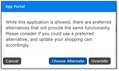 • When a user clicks the Add to Cart button of a Non-Preferred catalog, the user will see an alert with a global alert message as shown following.