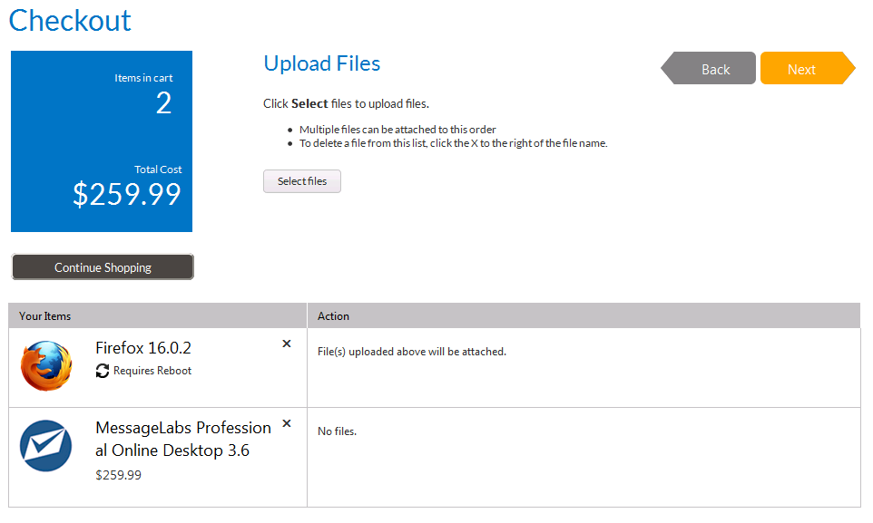 Perform the steps in Checking Out. The Upload Files panel of the Checkout Wizard opens.